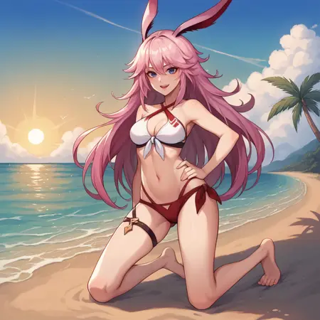 YaeSa, Fol001, Ysk_Smd, yae sakura, blue eyes, pink hair, long hair, white bikini, red criss-cross halter, front-tie bikini top, maroon side-tie bikini bottom, panty straps, mismatched bikini,