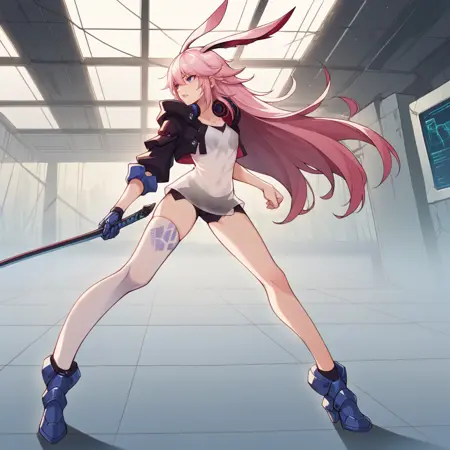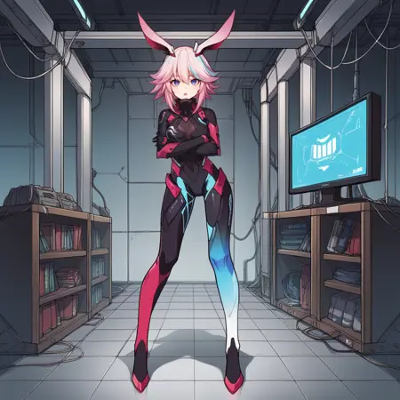 YaeSa, Fol004, Ysk_Neo, yae sakura, blue eyes, pink hair, armored bodysuit, black bodysuit, turtleneck bodysuit, neon trim, light blue hair, streaked hair, headgear, asymmetrical legwear, miscolored legwear, asymmetrical gloves, armored gloves, asymmetrical bodysuit,
