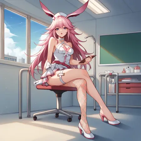 YaeSa, Fol001, Ysk_Sms, yae sakura, blue eyes, pink hair, halter dress, white criss-cross halter, cleavage, nurse cap, pink cross, frilled skirt, white skirt, white dress, white ribbon bow, white headwear, pink striped bow, loose belt, pink belt, pink trim, pink thigh holster, single thighhigh, fishnet thighhighs, white choker, single half glove, white glove, frilled thigh strap,