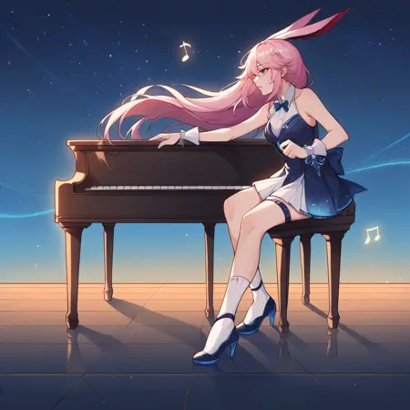 YaeSa, Fol002, Ysk_Snt, yae sakura, blue eyes, pink hair, shirt under dress, halter shirt, alt white shirt, collared shirt, sleeveless dress, alt pleated skirt, blue dress, light blue rose, light blue armband, star hair ornament, layered skirt, blue skirt, alt white skirt, blue bow flower, white striped bowtie, bare shoulders, black wrist bow, white frilled wrist cuffs, white half gloves, blue thigh strap,