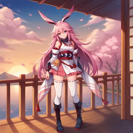 YaeSa, Fol001, Ysk_Def, yae sakura, blue eyes, pink hair, sleeveless kimono, white kimono, rope, obi, fox mask, mask on belt, black turtleneck, red sash, sash, bare shoulders, red ribbon, collarbone, ribbon-trimmed thighhighs, white thighhighs, pink skirt, plaid skirt, pleated skirt, wrist guards, wrist ribbon, detached sleeves, white wide sleeves, cross-laced footwear, dark purple knee boots