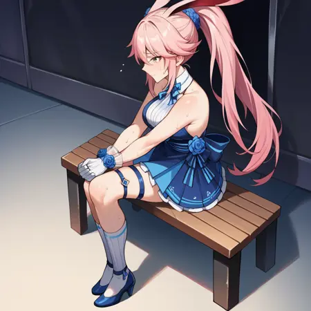 YaeSa, Fol002, Ysk_Snt, yae sakura, blue eyes, pink hair, shirt under dress, halter shirt, alt white shirt, collared shirt, sleeveless dress, alt pleated skirt, blue dress, light blue rose, light blue armband, star hair ornament, layered skirt, blue skirt, alt white skirt, blue bow flower, white striped bowtie, bare shoulders, black wrist bow, white frilled wrist cuffs, white half gloves, blue thigh strap,