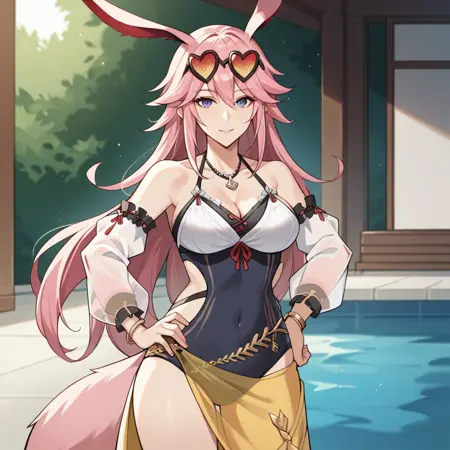Yae_Swimsuit, pink tail, jewelry, one-piece swimsuit, see-through sleeves, sarong, halterneck, necklace, detached sleeves, bare shoulders, bare legs, sunglasses on head, cleavage,