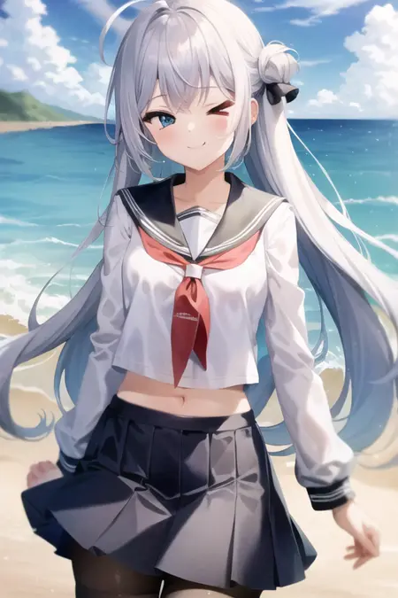 また、上記のトリガー語と一緒に 片目を閉じた という表現をプロンプトに加えて試してみてください(生成が難しい場合もあります)。