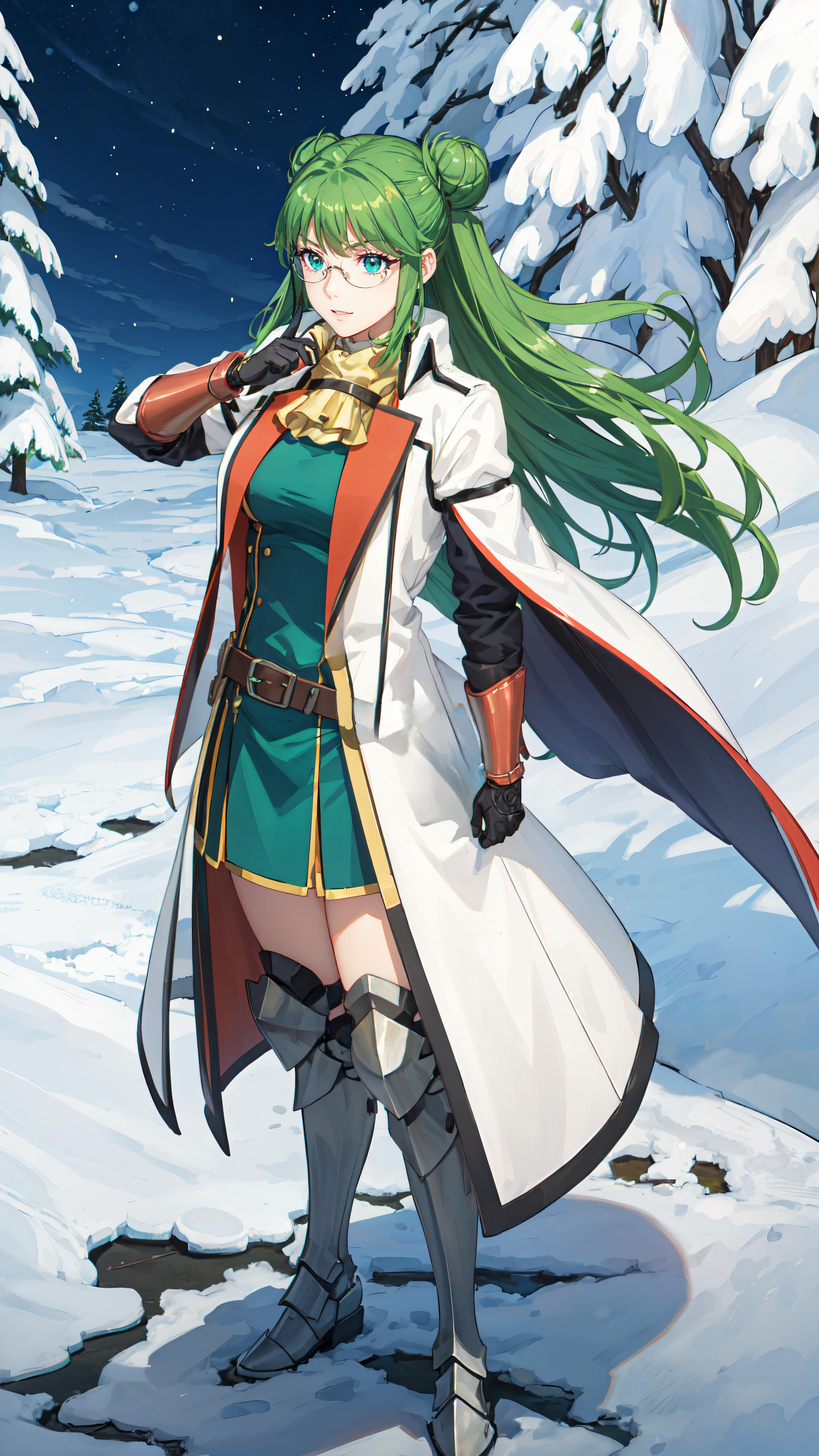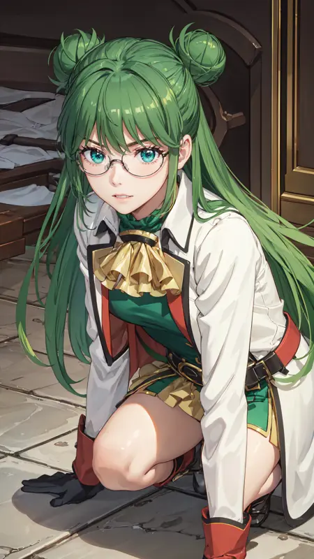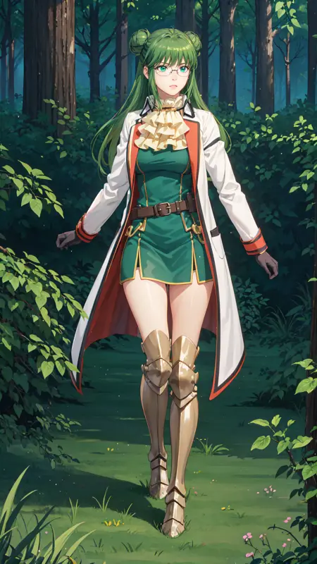 long hair, green hair, messy double bun, green eyes, glasses, white lab coat, green dress, black gloves, armored boots