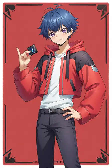 yu-yu kondo,red-black hooded jacket,hood down,white shirt,black pants,red footwear,socks