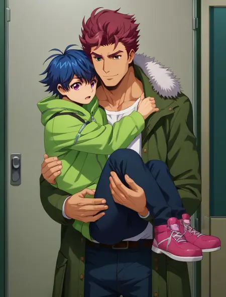 yu-yu kondo,red-black hooded jacket,hood down,white shirt,black pants,red footwear,socks