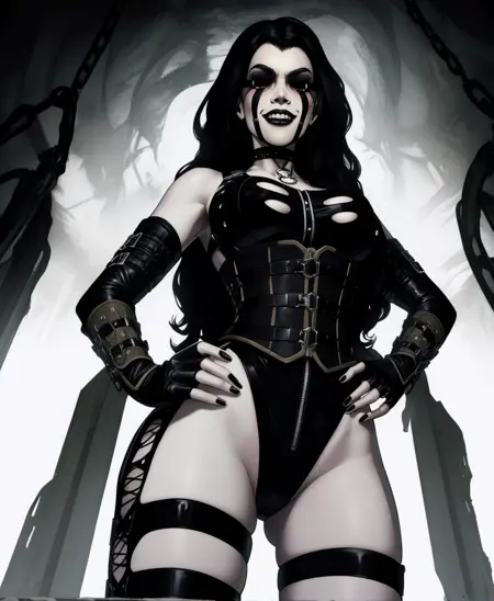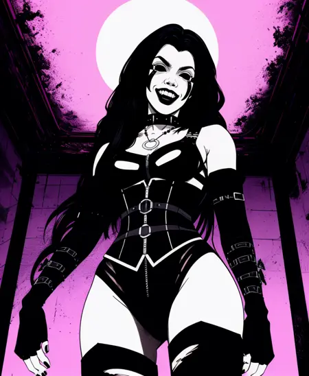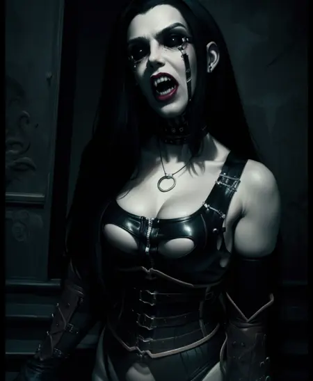 项圈、项链、紧身胸衣、分离袖、黑色紧身衣、露指手套、靴子或大腿靴,