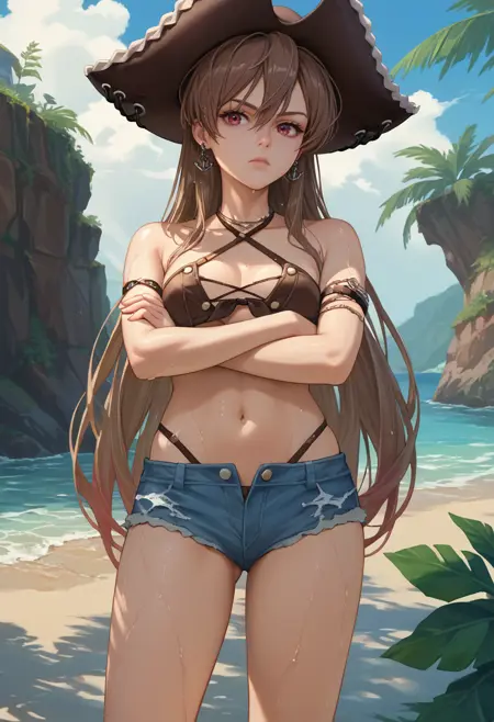 Private Après Midi: jeanbartbikini, brown hair, brown headwear, pirate hat, cross-laced clothes, brown bikini, highleg bikini, halterneck, criss-cross halter, front-tie bikini top, arm strap, denim shorts, microshorts, cutoffs, anchor earrings, bare shoulders