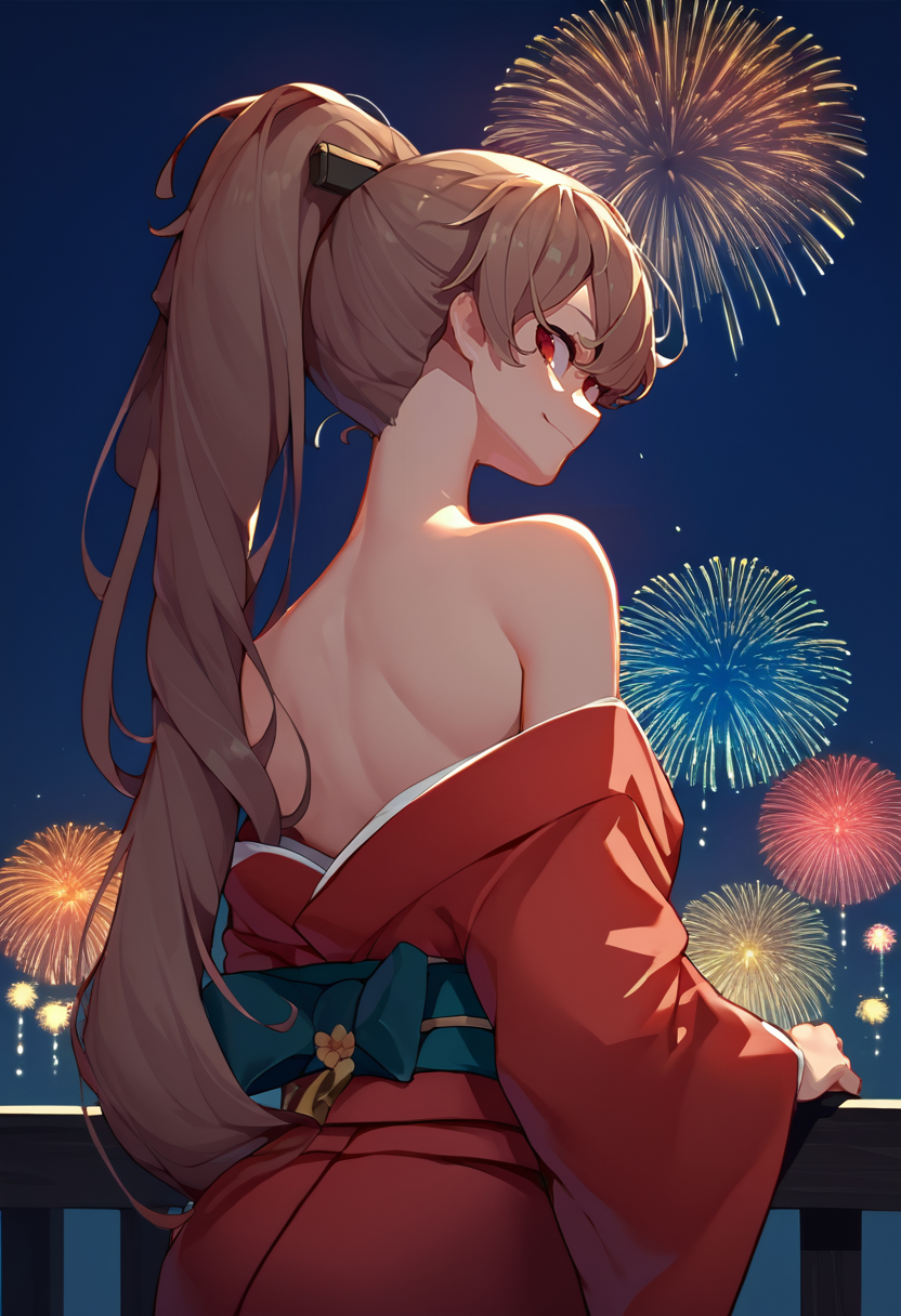 Default Outfit: jeanbartdef, high ponytail, hair bow, cross-laced clothes, black jacket, cropped jacket, high collar, aiguillette, long sleeves, sleeve cuffs, corset, bustier, red gloves, half gloves, black shorts, short shorts, single thighhigh, vertical-striped thighhighs, earrings, black choker, o-ring choker, cleavage