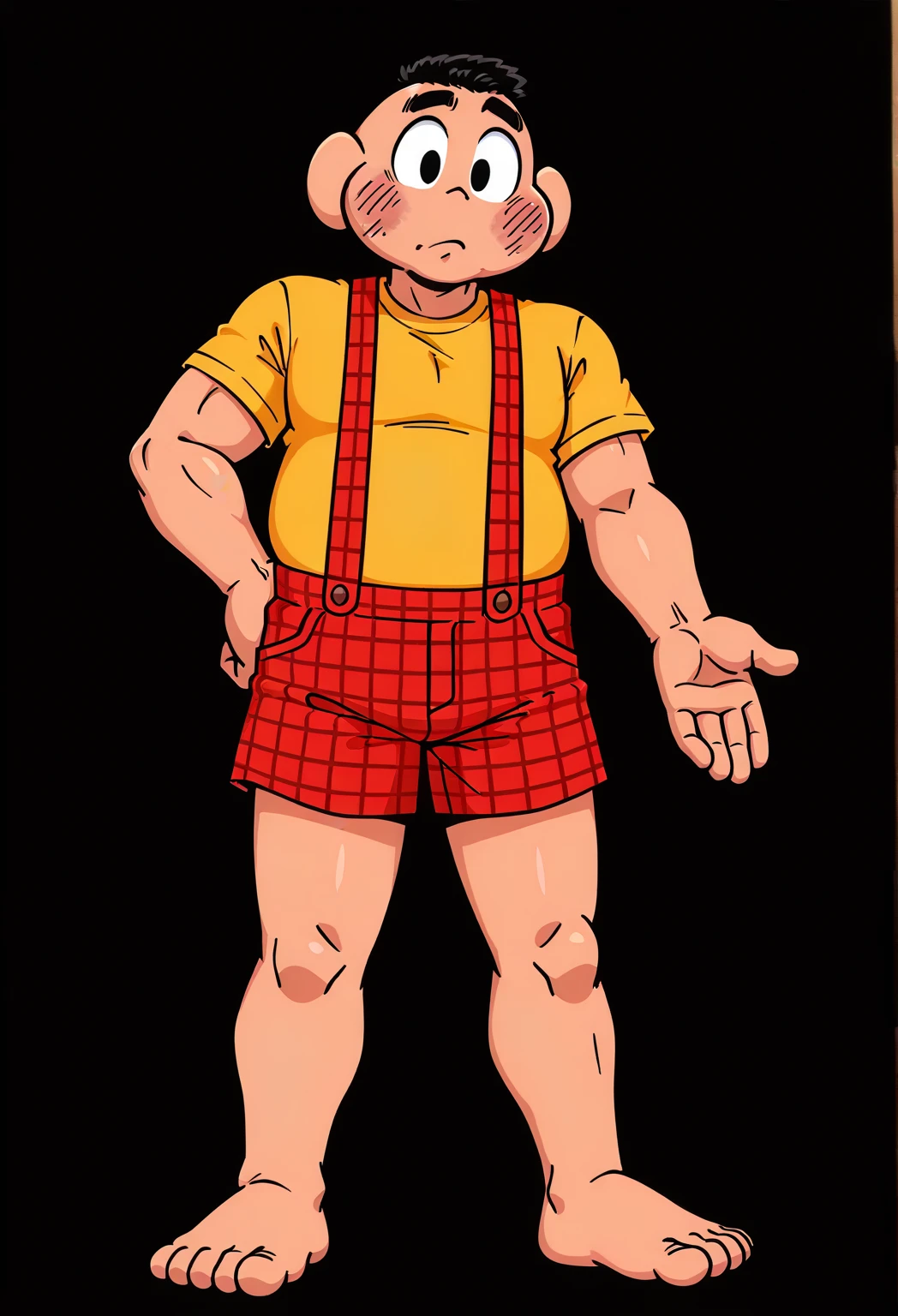 CascaoSmudgeTDM, 1boy, black, bushy hair, bald, black eyes, oval shaped eyes, big cartoonish eyes, yellow shirt, red checkered shorts, singular red suspender, dirty cheeks, short, chibi