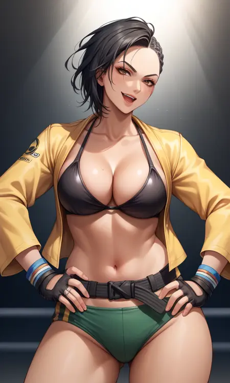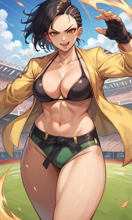 她的战斗服装:"LauraBattle, 不对称发型, 短发, 辫子, 黑色比基尼, 绿色运动内裤, 黄色敞开式夹克, MMA拳套"。