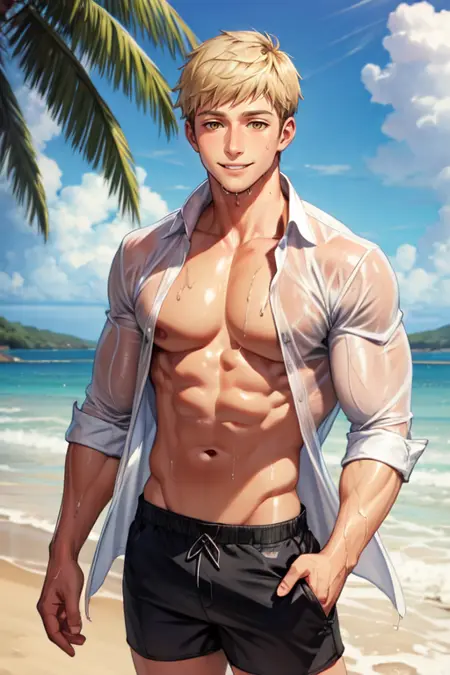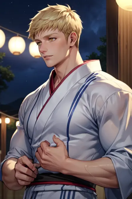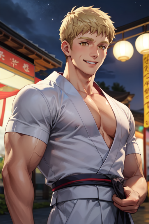 触发词:,laios touden,短发,金发,黄眼, bara,肌肉发达,肌肉男性,胸肌,大胸肌