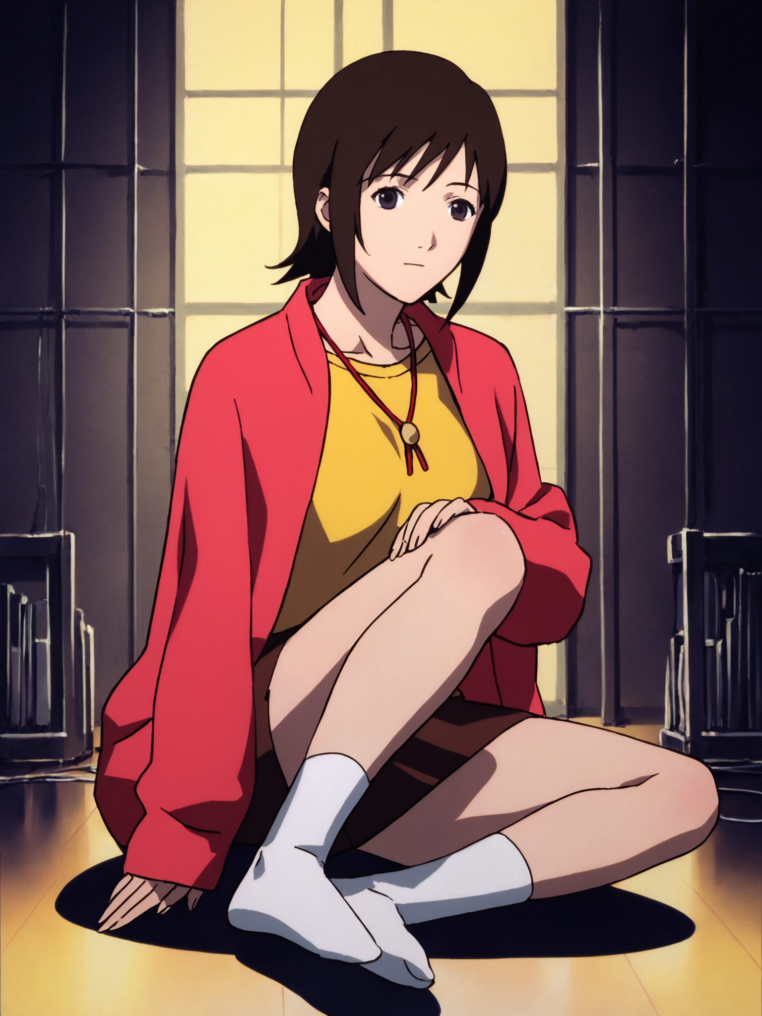 mizuki alice, 빨간 재킷, 노란 셔츠, 목걸이, 갈색 치마, 짧은 흰 양말