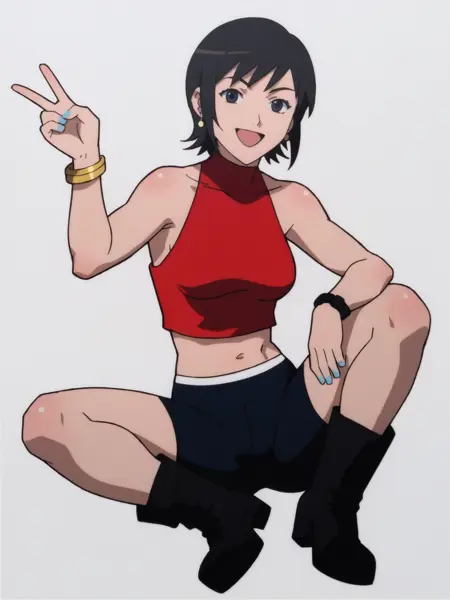 mizuki alice, red sleeveless crop top, black bike shorts, long black boots, gold bracelet, black watch, white earrings, blue nail polish