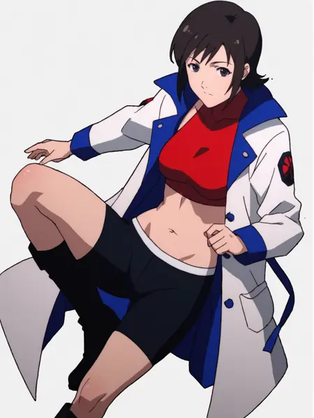 mizuki alice, red sleeveless crop top, black bike shorts, long black boots, long white-blue coat (or just long white coat if coming out wrong)