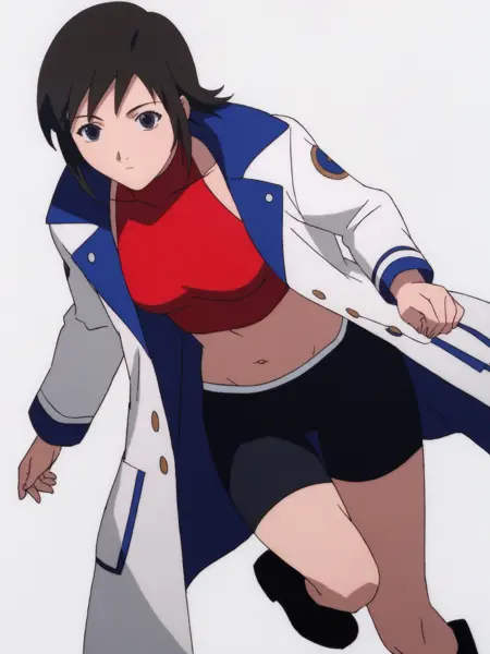 mizuki alice, 빨간 슬리브리스 크롭탑, 검정 바이크 쇼츠, 긴 검정 부츠, 긴 흰-파란 코트 (혹은 잘못 나올 경우 단순히 긴 흰 코트)