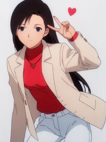 mizuki alice (타임 스킵), 베이지 재킷, 빨간 터틀넥 셔츠, 하트 목걸이, 흰 바지, 갈색 신발, 핸드백