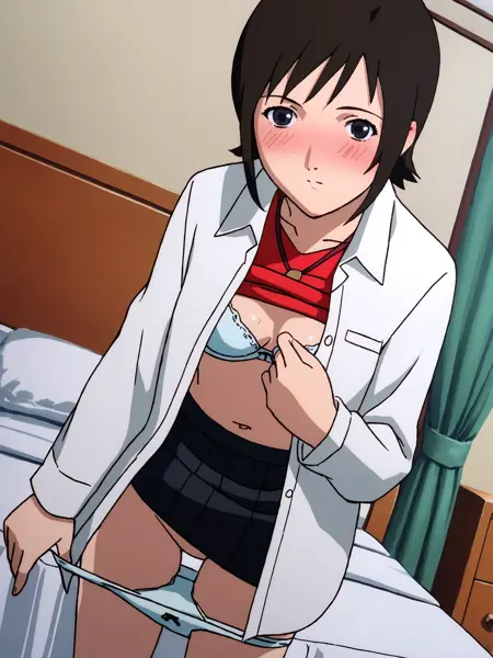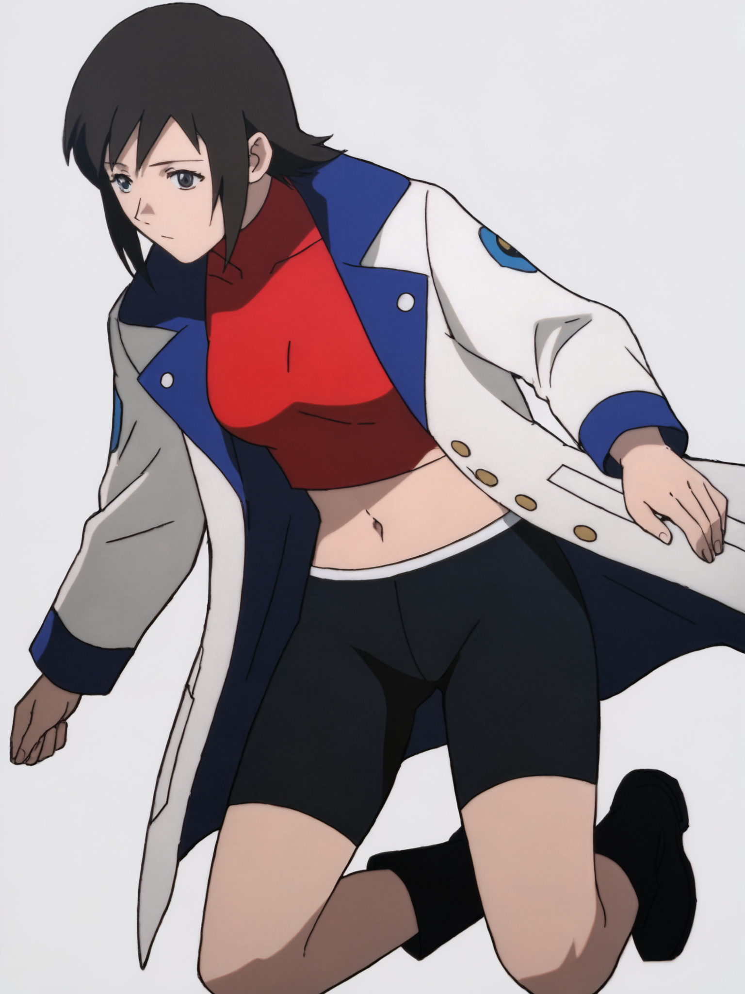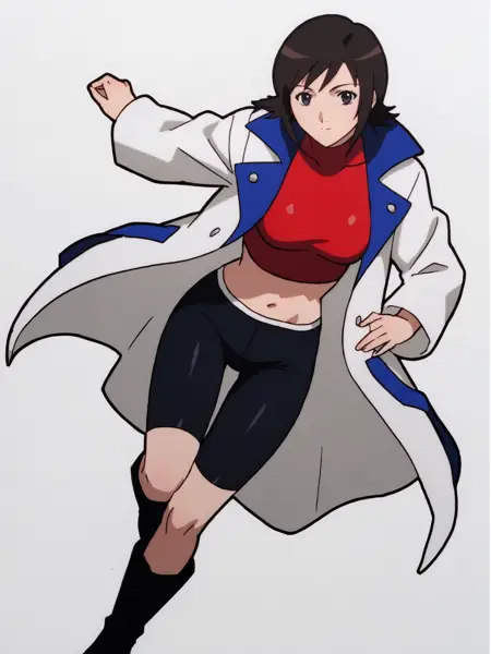 mizuki alice, red sleeveless crop top, black bike shorts, long black boots, long white-blue coat (or just long white coat if coming out wrong)