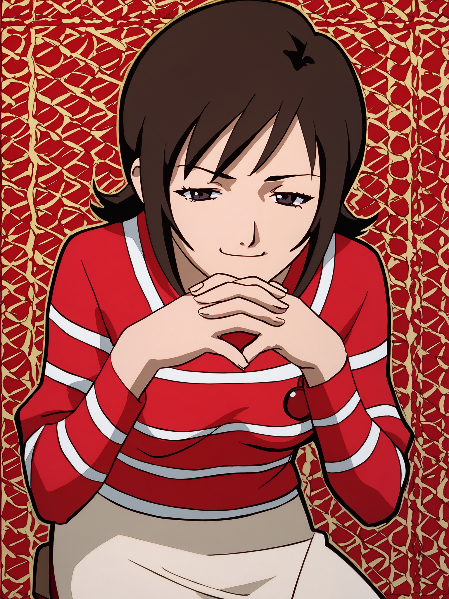 mizuki alice, red jacket, yellow shirt, necklace, brown skirt, short white sock