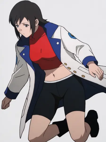 mizuki alice, 빨간 슬리브리스 크롭탑, 검정 바이크 쇼츠, 긴 검정 부츠, 긴 흰-파란 코트 (혹은 잘못 나올 경우 단순히 긴 흰 코트)
