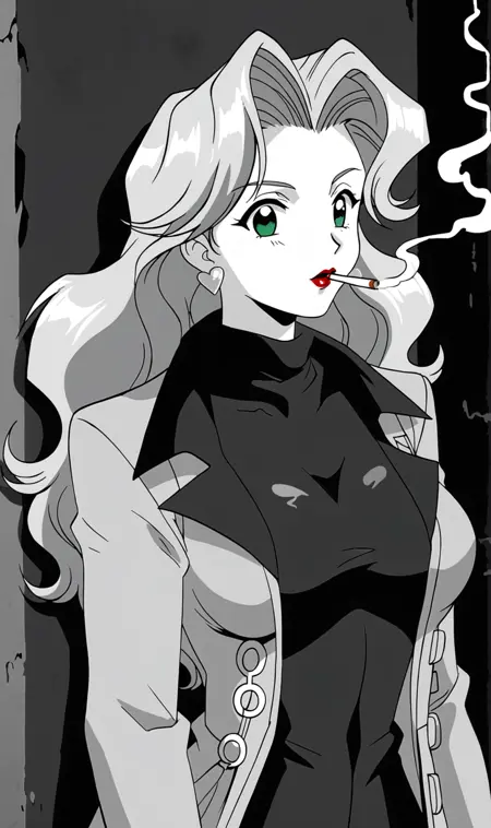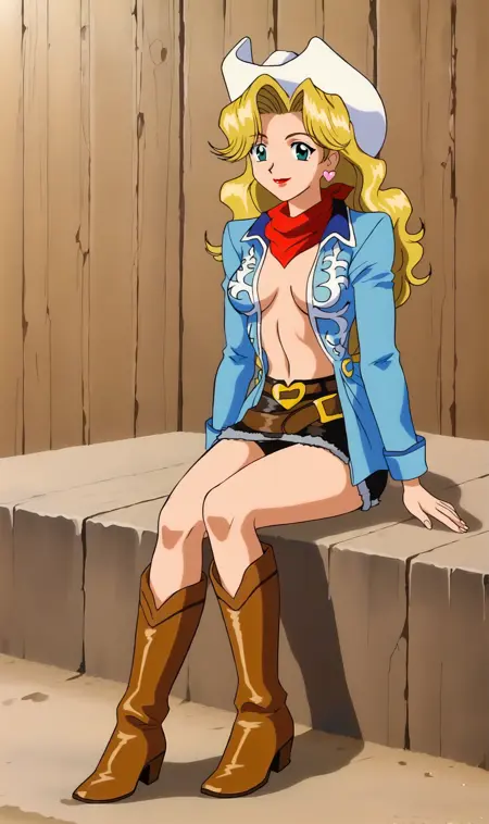 Retro Artstyle optionalMain Outfit-'blonde, long hair, green eyes, lipstick, heart earrings, cowboy hat, red scarf, blue center opening jacket, belt, fur-trimmed skirt, cowboy boots(not official to the outfit, so I just made something, optional of course)' _Not too accurate on the white patterns on jacket or the belts\*