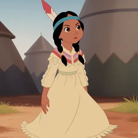 TigerLily, 1girl, solo, black hair, twin braids, brown eyes, dark skin, blue headband, feather hair ornament,