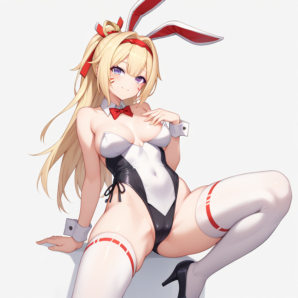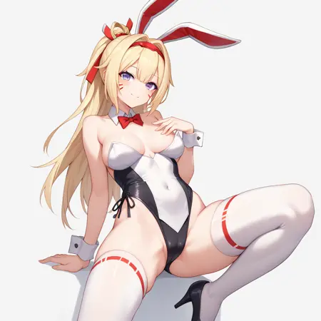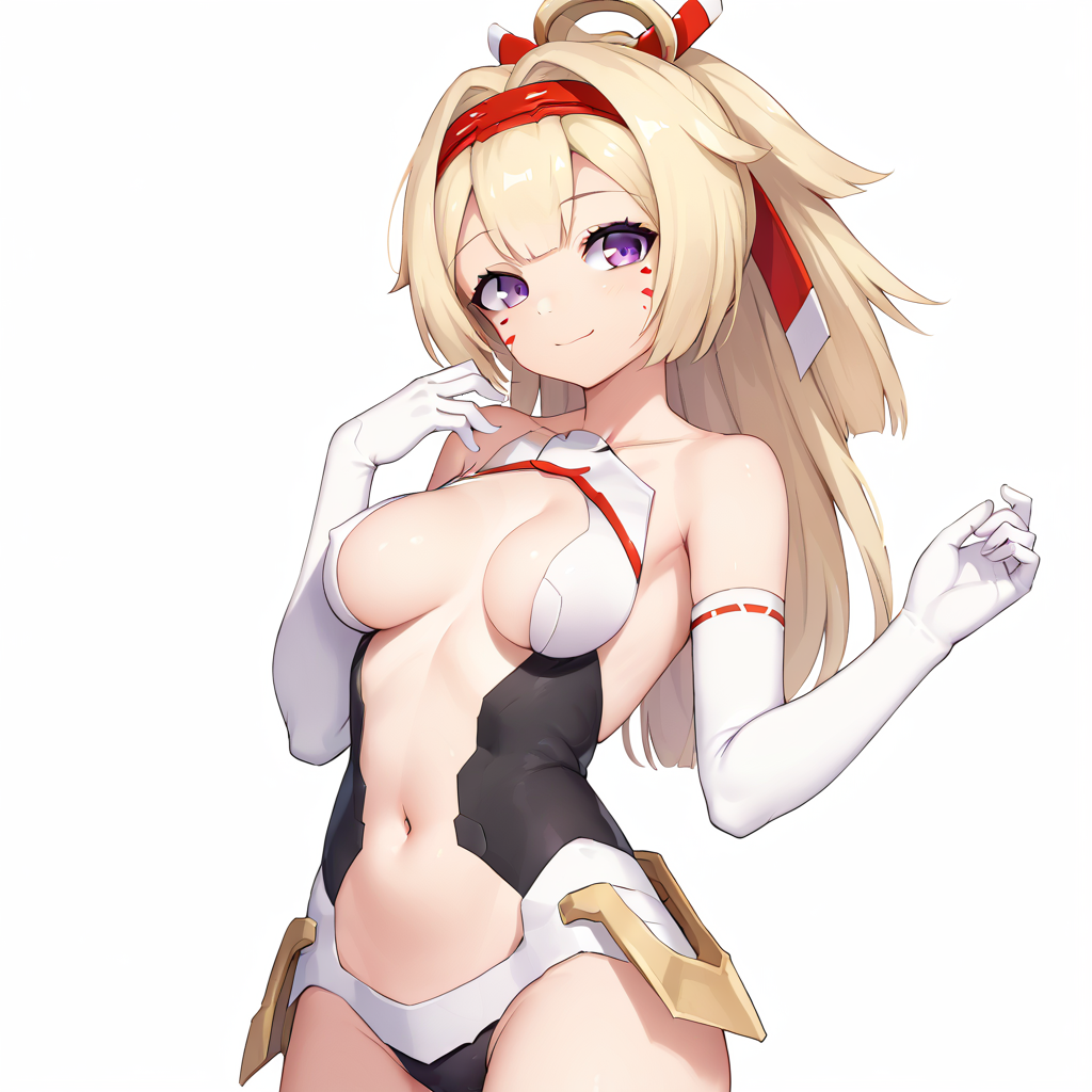 asra archer, blonde hair, purple eyes, red hairband, high ponytail, white elbow gloves, clothing cutout, bare shoulders
