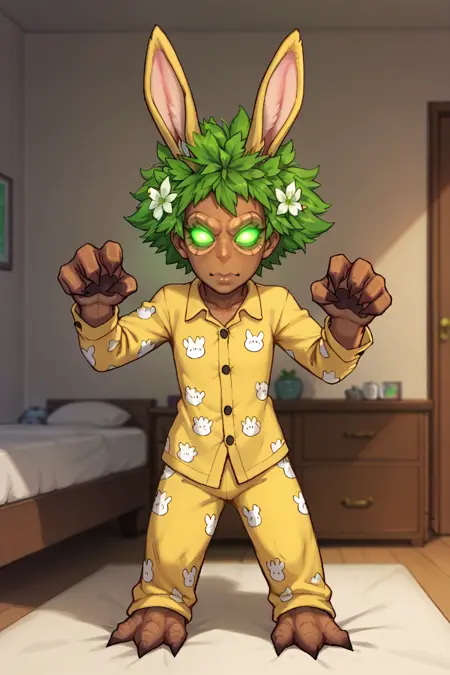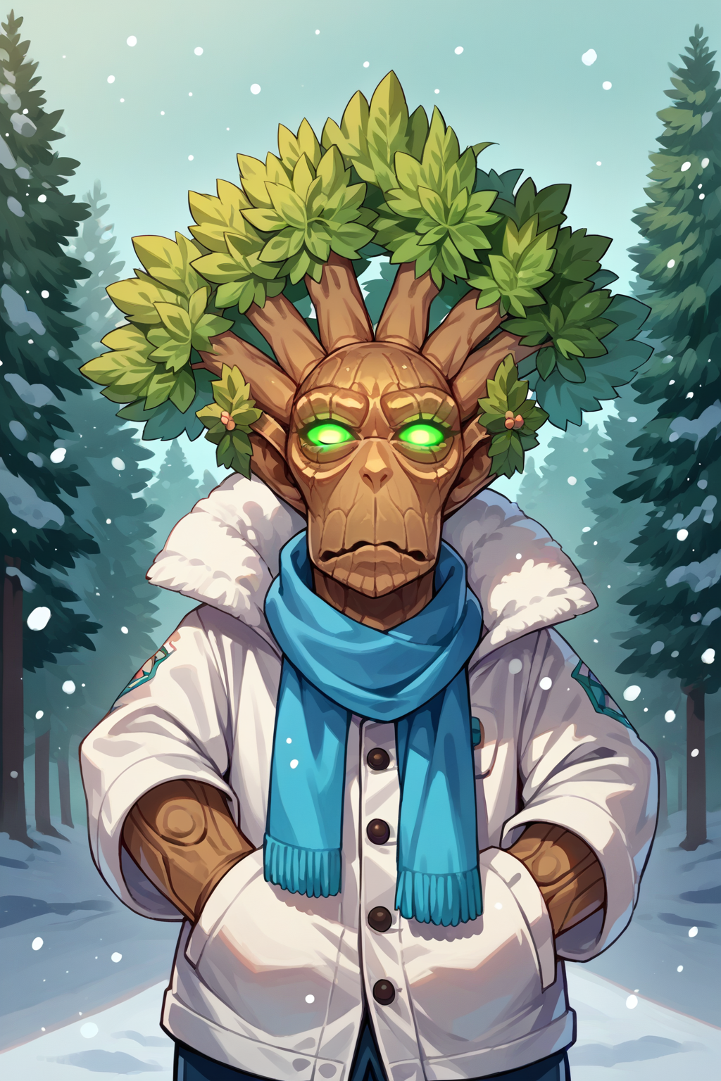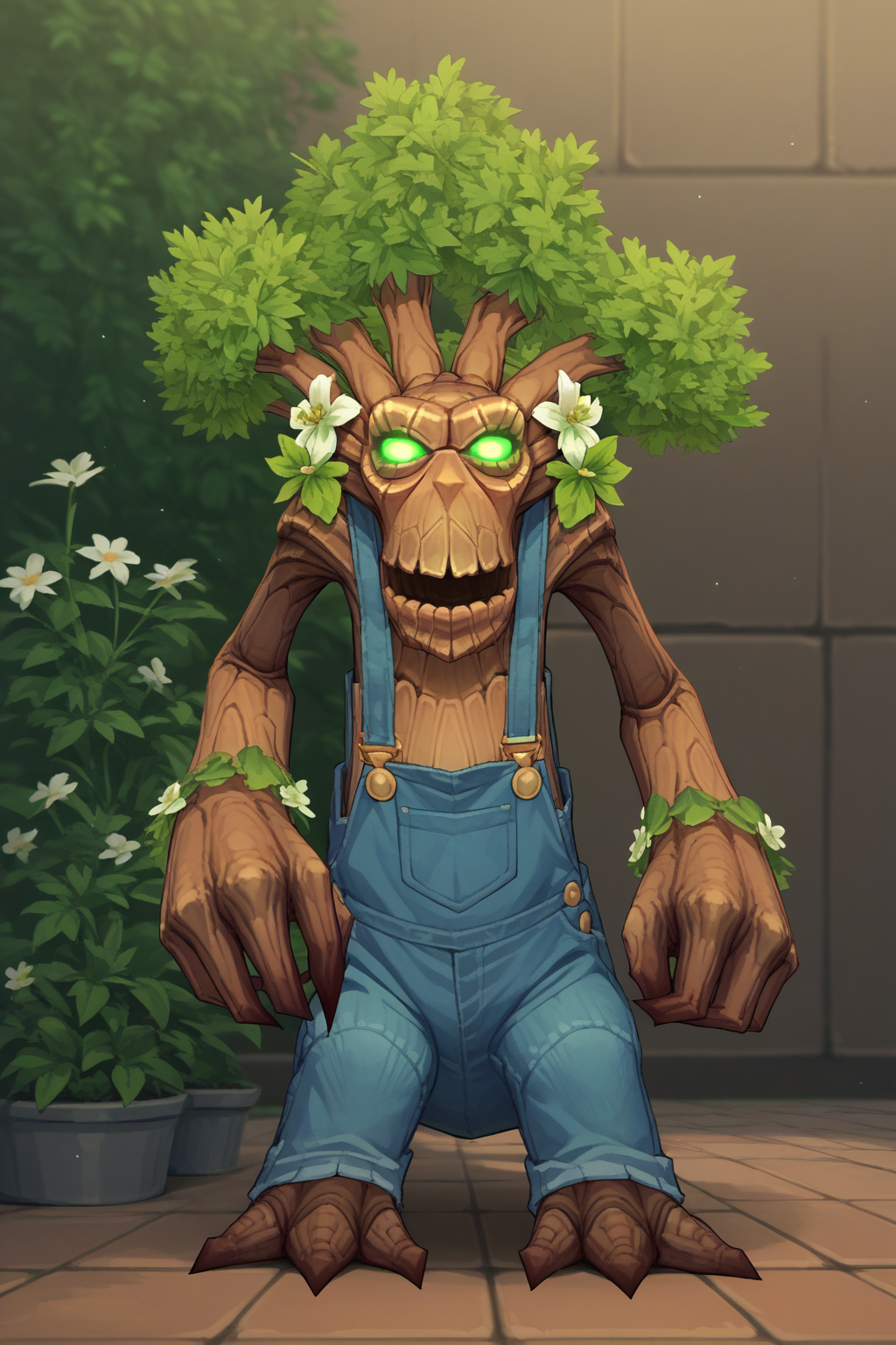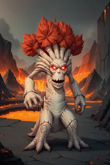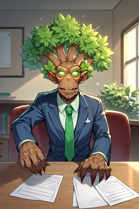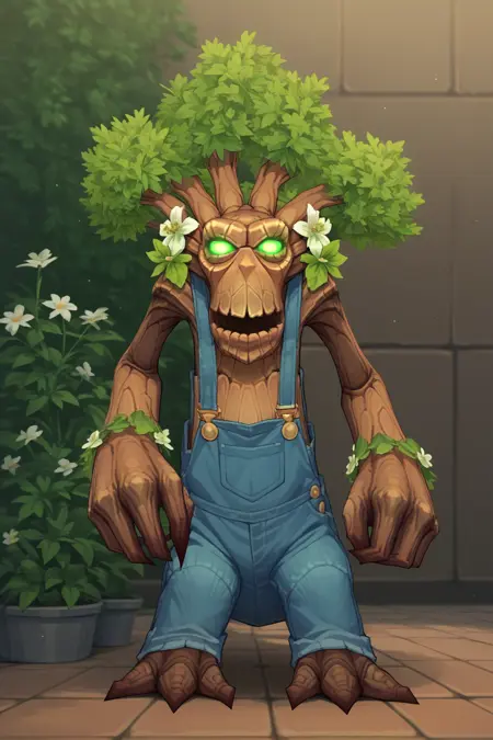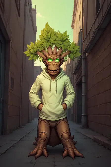 主提示词: NSTreantWoW,棕色皮肤,绿色眼睛,发光的眼睛,绿色头发,短发,怪物