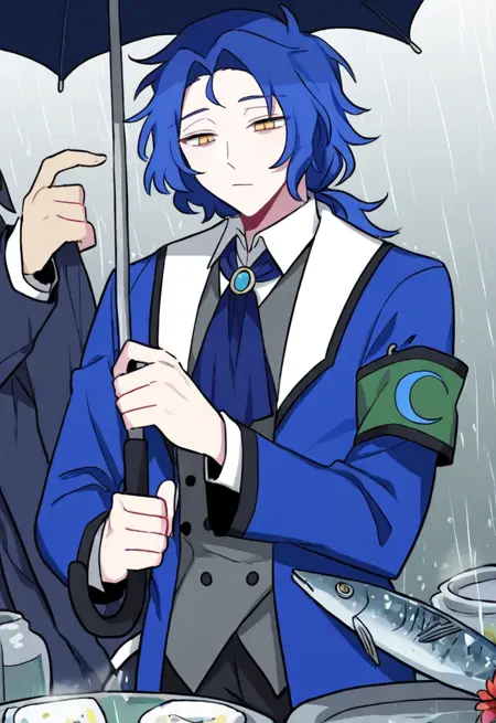 ChesedLC, white shirt, grey vest, blue coat, open coat, armband, black pants, black footwear, ascot