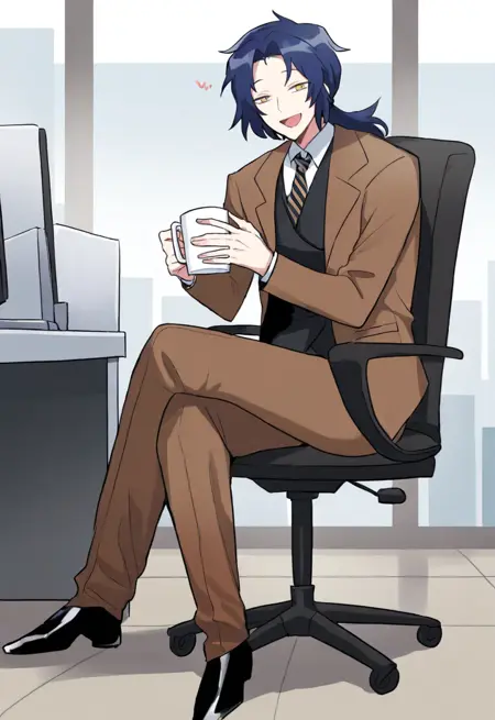 ChesedLOR, low ponytail, black shirt, blue ascot, black pants, black footwear, blue coat, open coat