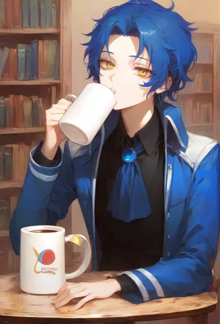 ChesedLOR, low ponytail, black shirt, blue ascot, black pants, black footwear, blue coat, open coat