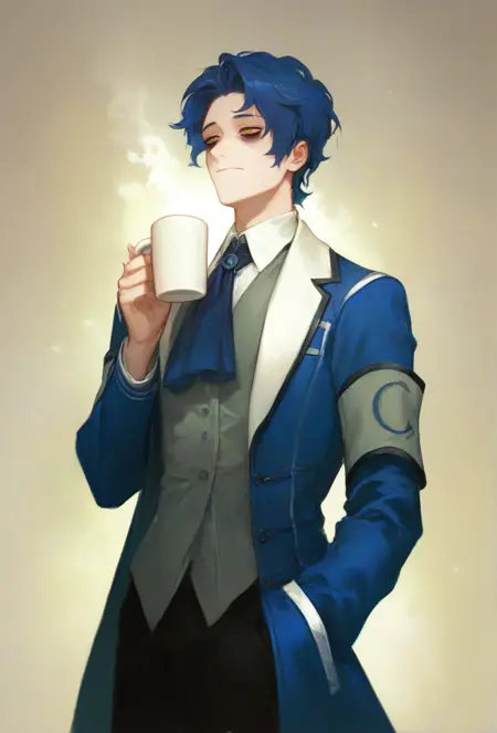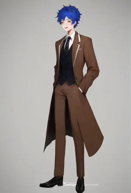 ChesedLC, white shirt, grey vest, blue coat, open coat, armband, black pants, black footwear, ascot
