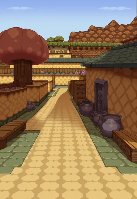LttPKV, outdoors, rocky terrain, brown hills, tree, day, daylight, blue sky, cloud, yellow house, blue roof, red roof, grass wall, wall, pot, wooden bench이 모델과 함께 사용할 일반 태그: