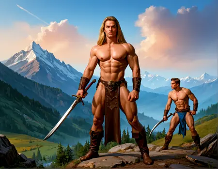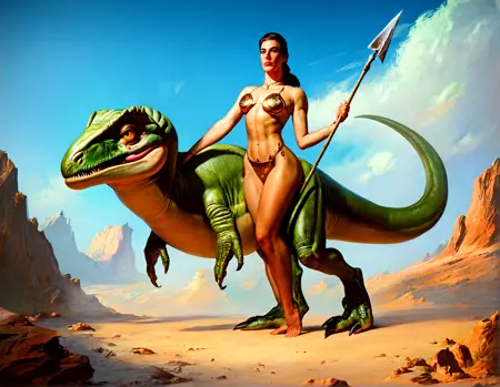"긴 금발 머리와 비키니 갑옷을 입고 검을 휘두르는 잔혹한 여전사가 바위 산 위에 서 있고, 배경에는 용이 보인다. 그녀의 근육질 몸매와 사실적인 특징이 햇빛에 의해 강조된다."