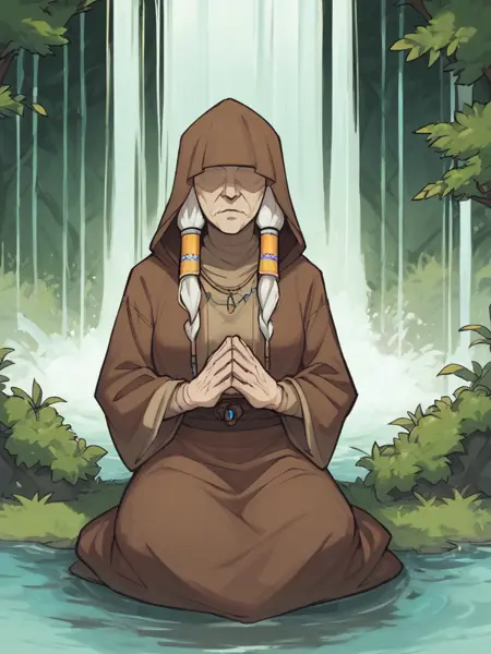 old woman, solo, kreia, neutral, hair tubes, no pupils, hood, white hair, brown robes