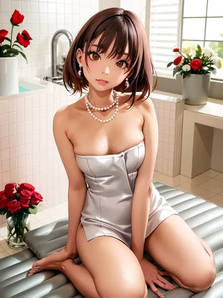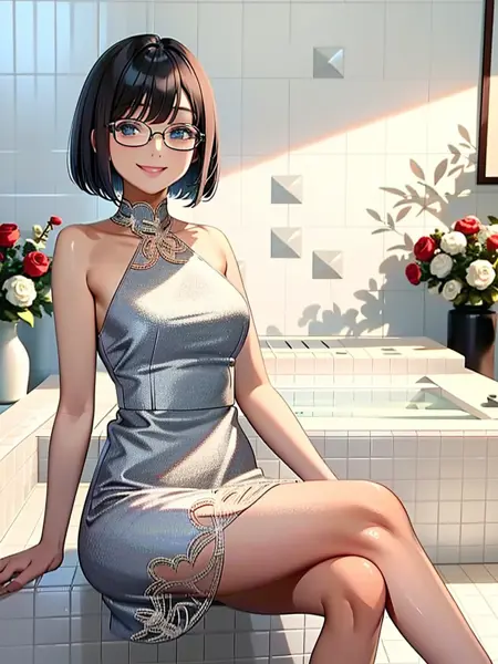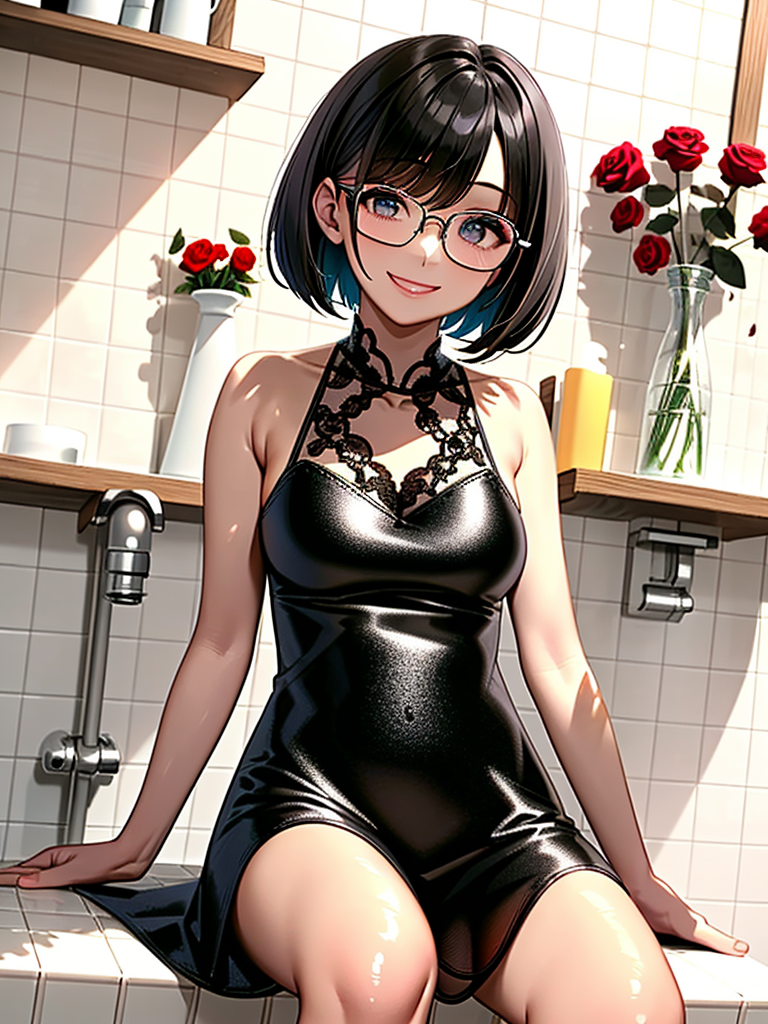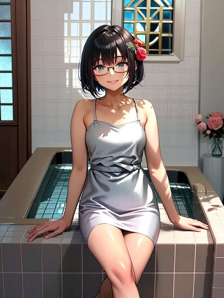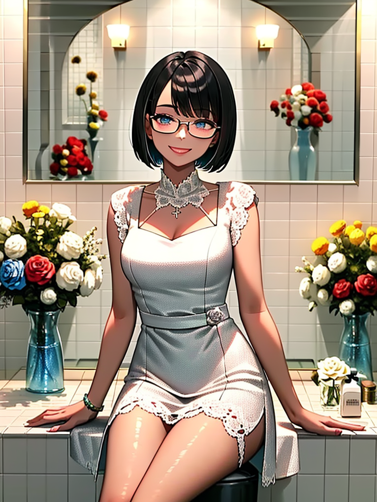 soapland, 1girl, solo, long hair, sitting, smile, crossed legs, dress, looking at viewer, flower, rose, tiles, indoors, sink, white dress, tile wall,
