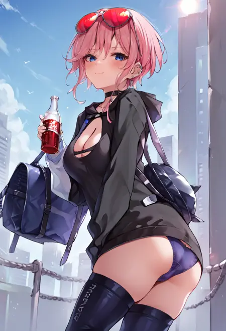 syzdb, 1girl, solo, breasts, looking at viewer, blush, smile, short hair, bangs, blue eyes, large breasts, simple background, thighhighs, szb_outfit, long sleeves, white background, holding, cleavage, closed mouth, underwear, panties, pink hair, ass, thighs, choker, black thighhighs, hood, bag, clothing cutout, leaning forward, black choker, piercing, cleavage cutout, sunglasses, bottle, eyewear on head, shoulder bag, tinted eyewear, red-tinted eyewear