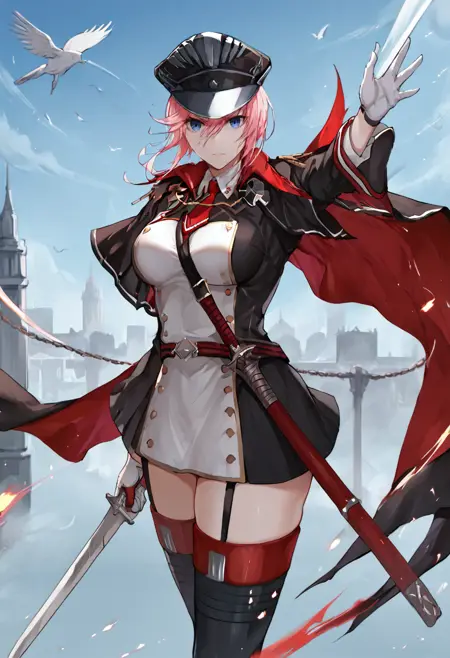 syzd, 1girl, solo, breasts, looking at viewer, blue eyes, large breasts, thighhighs, gloves, syz_hat, fighting stance, holding, hair between eyes, weapon, pink hair, sword, white gloves, cape, holding weapon, syy_uniform, zettai ryouiki, holding sword, red gloves, lora:Seydlitz-000008:0.9, best quality, masterpiece,