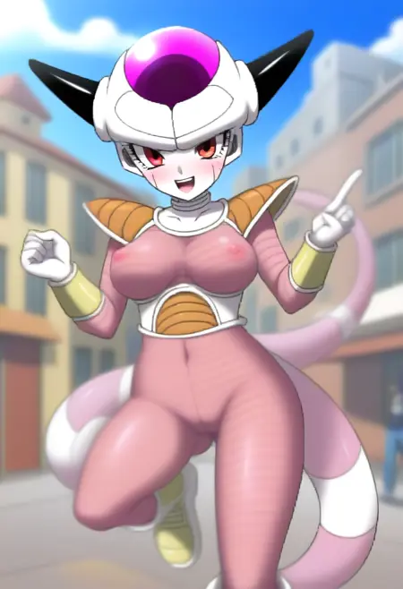 最终形态弗利萨:Furi-chan,白皮肤,红眼睛,尾巴,泳帽,耳机,肩甲,护胫,靴子,胸骨间有宝石