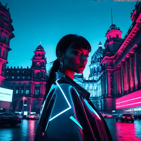 생기 넘치는 네온 컬러와 강렬한 대비로 도시의 에너지를 경험하세요. 캐논 50mm 카메라로 촬영된 4K 슈퍼 디테일 이미지는 도시 풍경의 생동감 있고 미래지향적인 분위기를 포착합니다. 역동적이고 기술적인 개념에 이상적입니다. 어두운 배경에 밝고 강렬한 색상이 대비되어 고에너지이자 시각적으로 강렬한 효과를 만들어냅니다. 광고, 야간 사진, 미래지향적 테마에 완벽합니다.