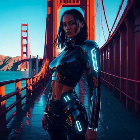 深入未来主义的赛博朋克世界。采用索尼35mm镜头拍摄,4K超细节画质,高对比色彩与锐利细节带来前卫现代的美学。适合富有远见与创新性的项目。图像融合霓虹灯光、未来都市景观与高科技与颓废元素的碰撞,营造出视觉上极具吸引力的反乌托邦氛围,完美适用于科幻主题、城市探索与前卫时尚拍摄。
