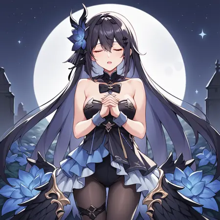 SeeleHi3, Hrb_Drk, seele vollerei, very long hair, light blue eyes, black hair, light blue hair, colored inner hair, black dress, frilled dress, sleeveless dress, halterneck, black bowtie, black gorget, black flower, flower hair ornament, black wrist cuffs, criss-cross strings, side slit, striped skirt, blue skirt, layered skirt, black pantyhose, pantyhose, frilled thigh strap, black thigh strap, low wings, feathered wings, black wings, black feathers, black armlet, mini crown, black crown,