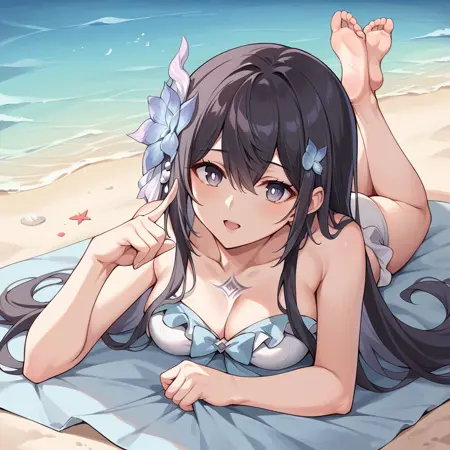 SeeleHi3, Hrb_Swm, seele vollerei, very long hair, black hair, light blue eyes, light blue hair, colored inner hair, frilled bikini, bow bikini, light blue bikini, gradient bikini, bow ribbon, bare neck, strapless bikini, light blue ribbon, long ribbon, chest tattoo, bikini skirt, waist cape, light blue flower, hair flower, front-tie bikini top,