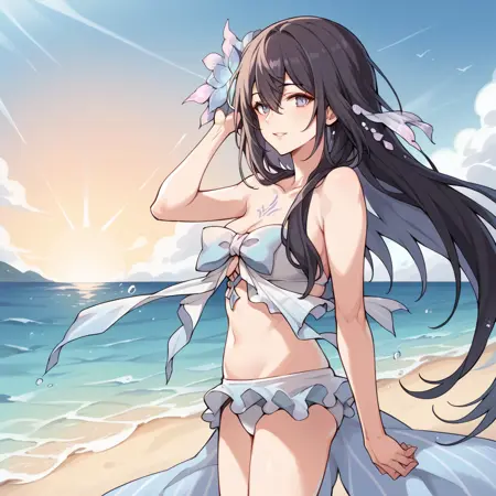 SelVel, Fol005, Sel_Bik, 蓝眼睛, 长发, 暴露胸部, 黑发, 浅蓝色内层发丝, 褶边比基尼, 无肩带比基尼, 泳衣外罩, 浅蓝色比基尼, 渐变比基尼, 替代渐变蝴蝶结, 紫色纹身, 替代胸部纹身, 浅蓝色花朵头饰, Seele Vollerei,