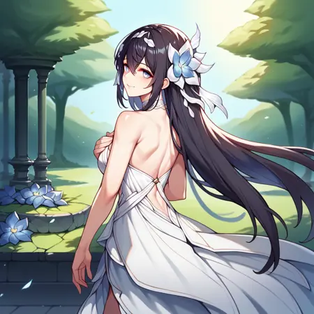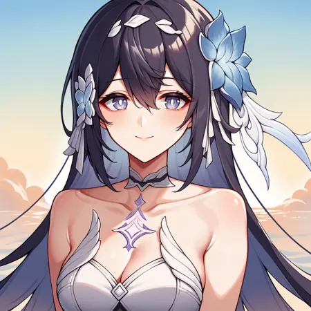 SeeleHi3, Hrb_Def, seele vollerei, very long hair, black hair, light blue eyes, light blue hair, colored inner hair, pink gemstone, chest tattoo, detached collar, strapless dress, stomach cutout, navel, white headwear, veil, white dress, arm strap, criss-cross straps, white strap, multiple thigh straps, flower-trimmed dress, wrist strap, front slit, long skirt, gradient skirt, brooch, white armband, hair ornament, light blue flower, ankle wrap,