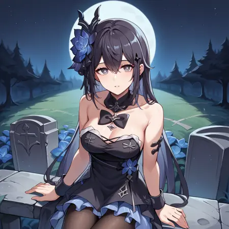SelVel, Fol005, Sel_Etn, long hair, blue eyes, black hair, light blue hair, colored inner hair, short dress, blue rose, different black dress, alt blue dress, black bowtie, bow flower, black detached collar, dark blue flower, black flower, alternate hair flower, black skeletal hand on arm, black wrist cuffs, black feathers, black feather skirt, shiny skirt, dark blue pleated skirt, layered skirt, black pantyhose, frilled thigh strap, alternate frilled skirt, bare shoulders, black veil, seele vollerei,