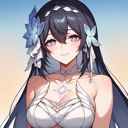 SelVel, Fol002, Sel_Scn, short hair, blue eyes, black hair, blue hair, colored inner hair, china dress, alternate white dress, covered navel, criss-cross straps, cleavage, multiple thigh straps, blue underskirt, blue ribbon, long skirt, white collar, side slit, white flower hair ornament, white tassel, alt halterneck, bare shoulders, blue detached sleeves, blue short sleeves, blue feather boa, blue flower, single elbow glove, blue gloves, seele vollerei,