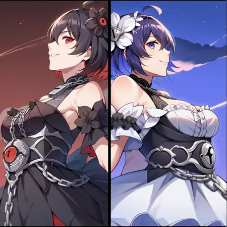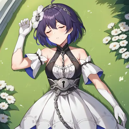SelVel, Fol002, Sel_Sty, short hair, blue eyes, black hair, blue hair, colored inner hair, halter dress, alternate white dress, chain between breasts, black halterneck, cleavage cutout, flower-trimmed dress, keyhole, chain, lock, alt corset, center frills, black corset, frilled bra, white bra, alt white skirt, bubble skirt, white detached sleeves, chain necklace, puffy short sleeves, asymmetrical gloves, white gloves, bare shoulders, hair flower, white flower, white thighhighs, thighhighs, seele vollerei,