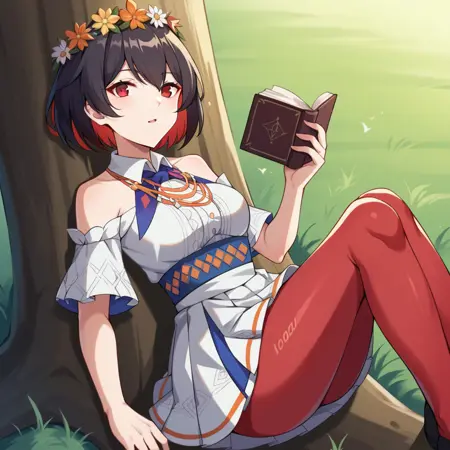 SelVel, Fol003, Sel_Esr, short hair, red eyes, black hair, red hair, colored inner hair, alt flower crown, flower wreath, alt jewelry, light blue skirt, alt high-waist skirt, alt pleated skirt, alt multicolored belt, alt multiple belts, fringe trim, alt off-shoulder shirt, alt collared shirt, blue neckchief, orange necklace, red pantyhose, alt pantyhose, alternate white shirt, white short sleeves, alt bracelets, alt pine tree print, seele vollerei,